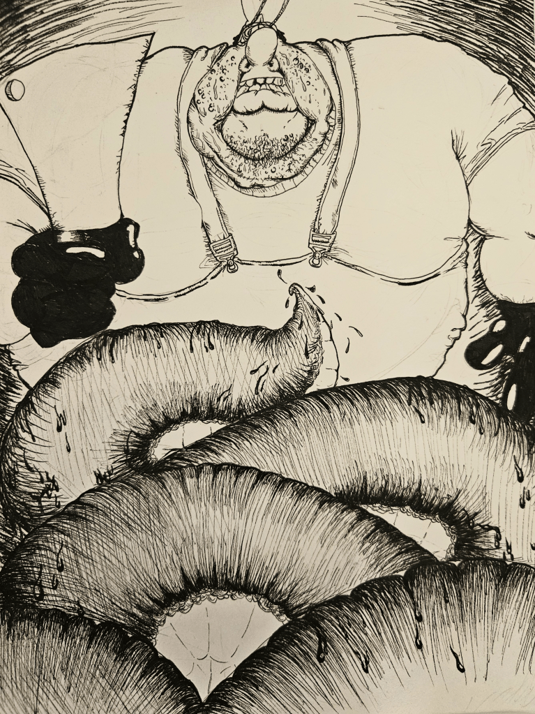 His mind is flooded with an extremely detailed vision of the squirming tentacle plunging through his eyeball–which pops in a seething gush of KY-Jelly-like vitreous humor–and burrowing into the wrinkled meat of his brain. Some part of him desperately wants nothing more than the tentacle buried in his skull.